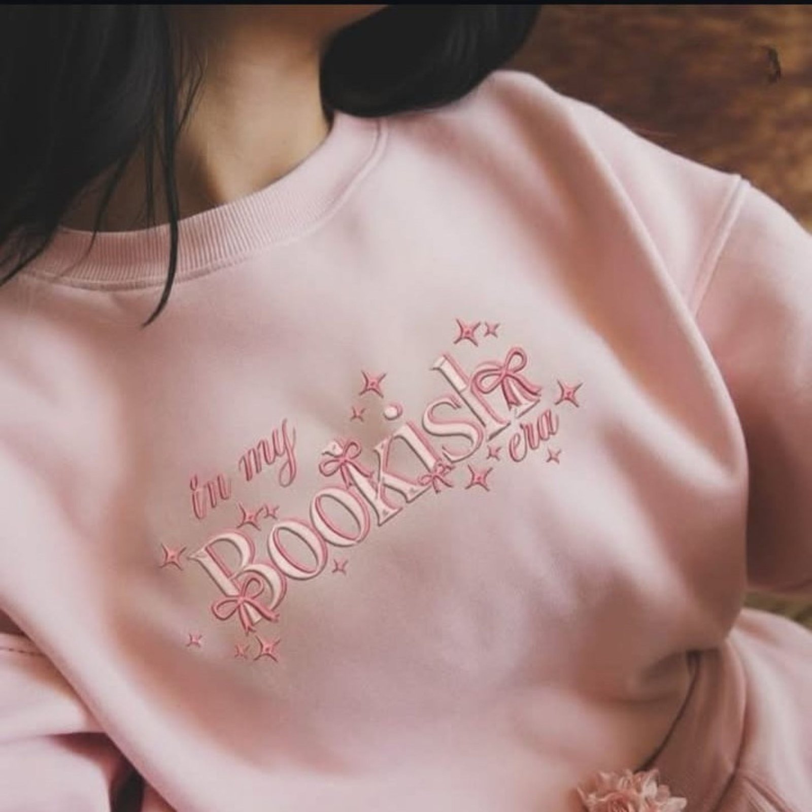 & Free ShippingA pastel pink sweatshirt with embroidered text “In my bookish era,” adorned with bows and stars. Soft, cozy, and stylish, it’s perfect for readers and dreamers who love to showcase their personality with fashion while staying comfortable for casual wear or relaxed lounging.