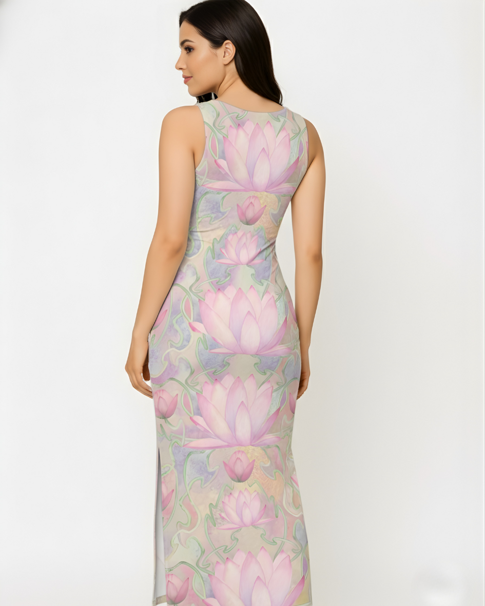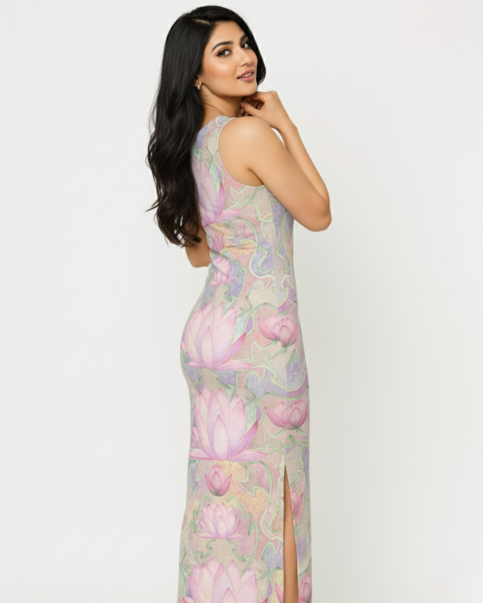 Embrace the essence of soft elegance with the Boydcon Maxi Dress. This breathtaking piece features a bespoke pastel print, reminiscent of tranquil lotus blooms and swirling waters, in muted shades of lavender, blush pink, and sage green.