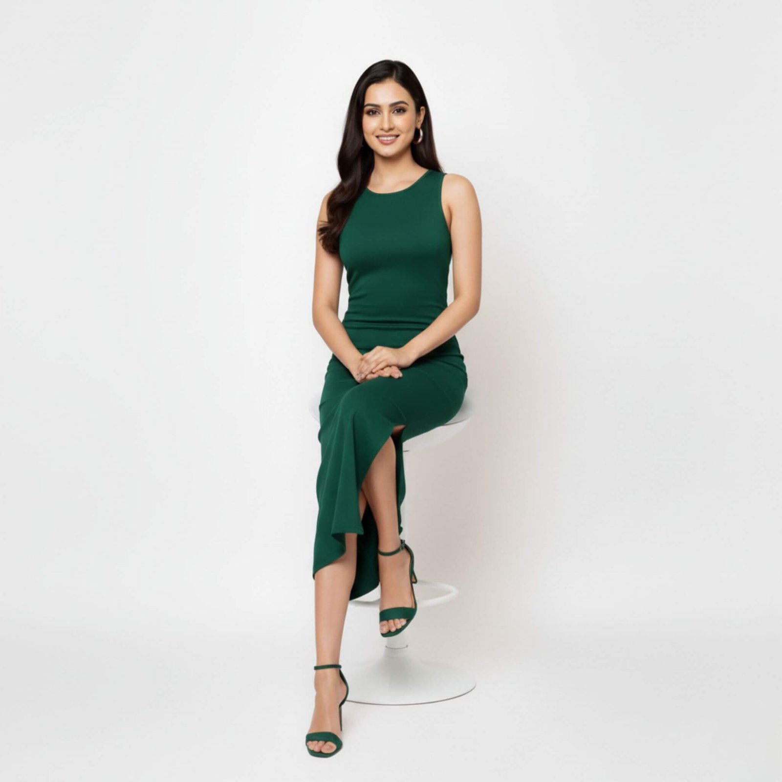 The most defining feature of the sleeveless forest green bodycon dress is its figure-hugging silhouette. Made with high-quality stretch fabric, the dress molds beautifully to the body while allowing ease of movement. The sleeveless design keeps it modern and versatile, while the slit detail adds a hint of boldness without being over the top. This thoughtful construction ensures that you look stylish without compromising on comfort, making it suitable for hours of wear.